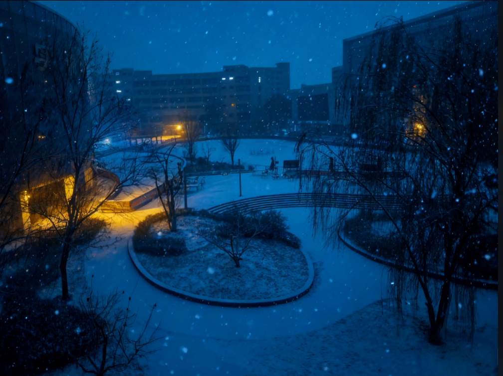 暮色四合时,图书馆的灯光次第亮起,像一颗颗星星落在雪地上。室内,学生们安静地翻动书页,一起讨论课题,偶尔抬头望向窗外的雪景,眼神中透着对知识的渴望。